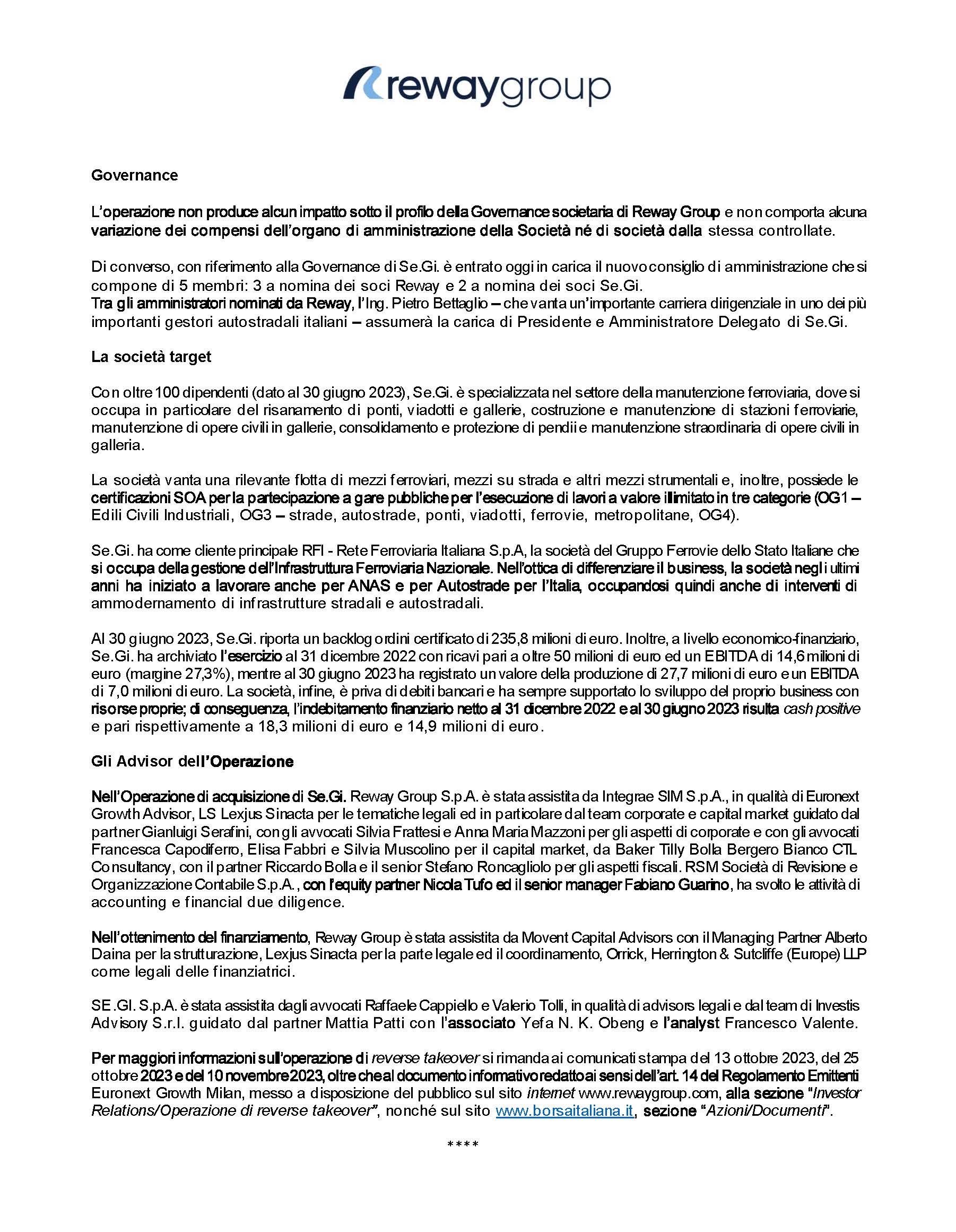 Perfezionato il Closing dell’acquisizione del 70% di Se.Gi. S.p.A.